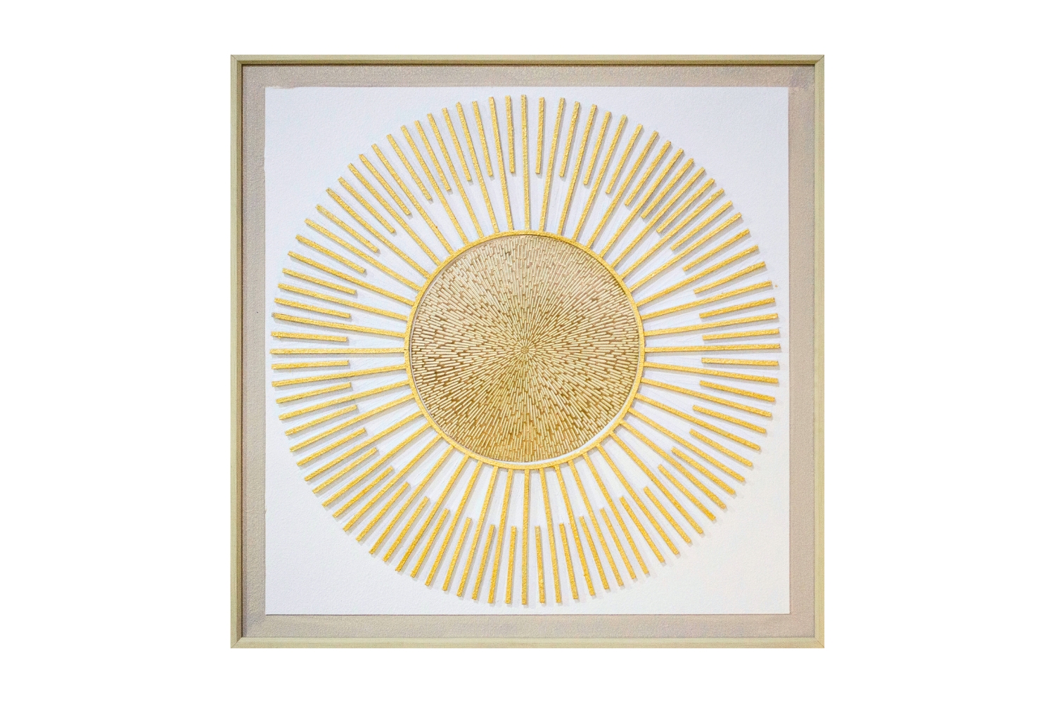 This elegant wall art features a durable solid wood frame that adds warmth and stability. The sunburst design, with its raised center and linear elements, creates depth and visual intrigue. The soft ivory background enhances the warm tones, offering a serene and sophisticated aesthetic, perfect for living rooms, bedrooms, or entryways.