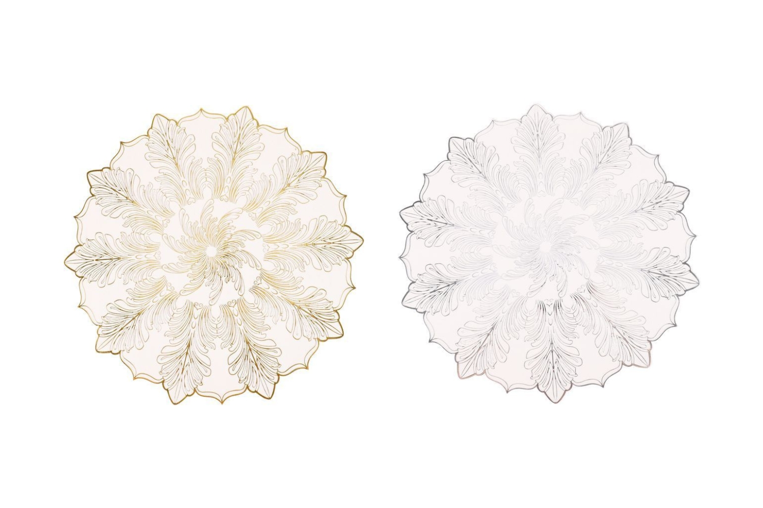 Enhance your dining table with these elegant feather design placemats. Made from durable PVC with metallic silver finishes, they provide a protective, easy-to-clean surface for both casual and formal occasions. Offered in gold or silver finishes to suit different table settings.