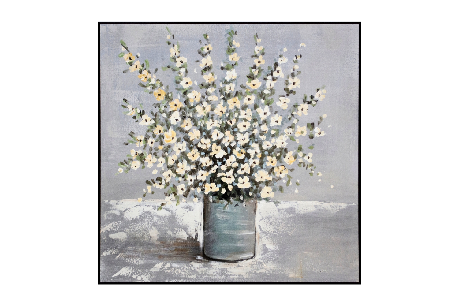 This hand-painted floral canvas showcases soft blossoms with layered texture and expressive brushwork for added depth. Framed in sleek aluminum and sized at 80 × 80 cm, it makes an elegant statement for modern interiors.