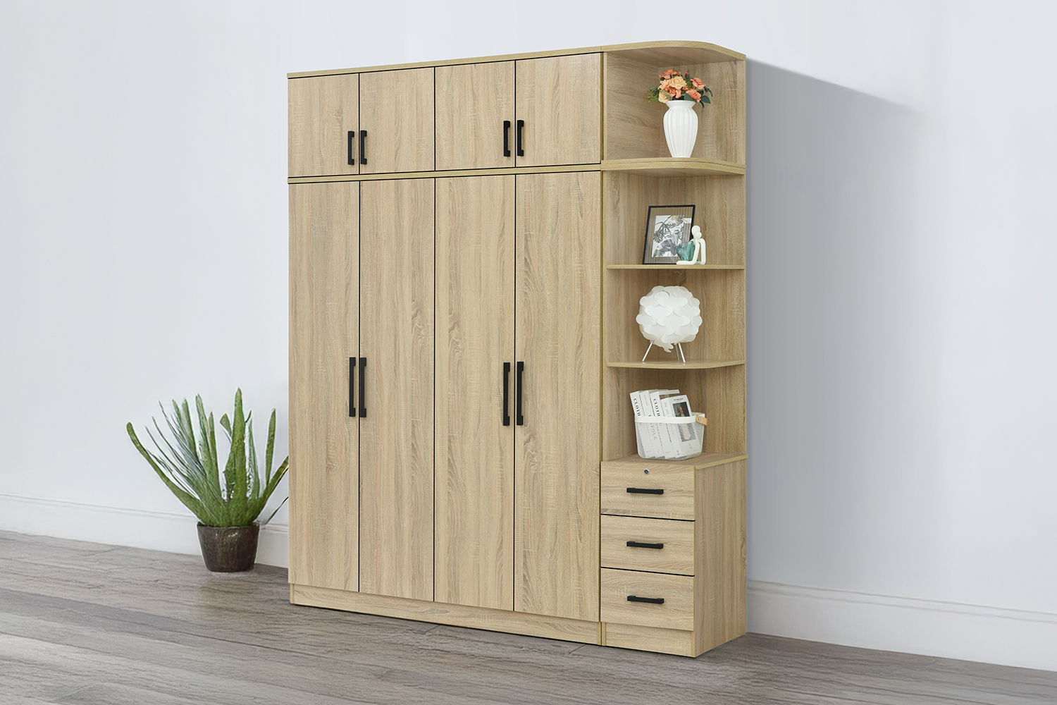 • Comprehensive Modular Design: Includes a 4-door wardrobe, 4-door top unit, 3-tier display shelf with drawers, and a top curved corner display shelf for versatile storage and styling options.