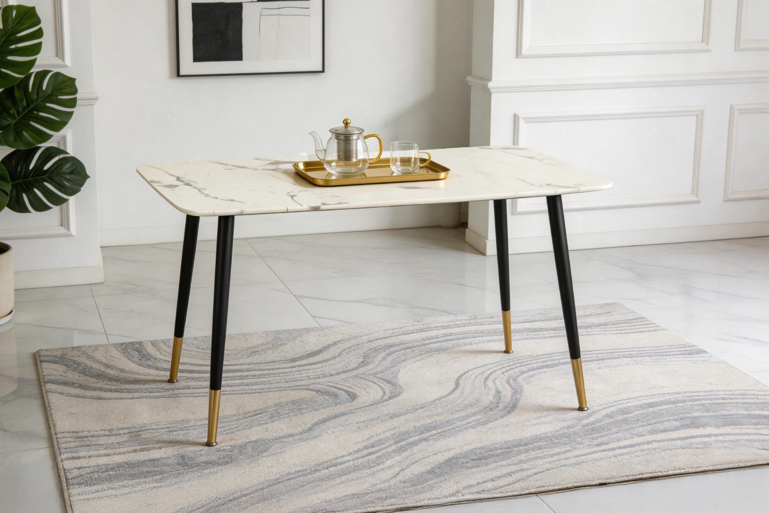 Veneer top in white color, rectangle shape, steel legs in black and gold color,