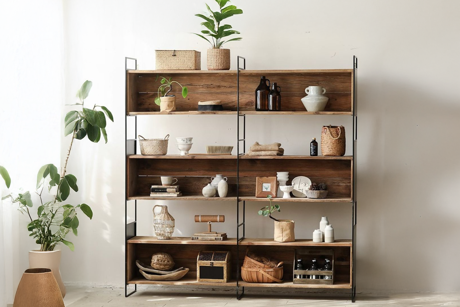 Introduce industrial flair and rustic charm to your space with the ELMORE Reclaimed Pine Wood Large Iron Shelf (74.8" x 71.2"), a durable and stylish solution for organized living.