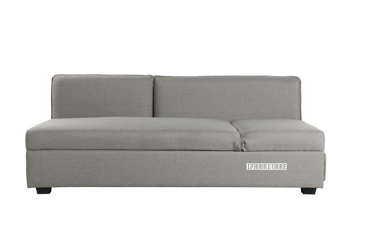 The unit is covered in an attractive, and practical, grey fabric. So, on one hand, its a three seater couch; now lift off one portion of the back of the couch -place at the other end, and it becomes a bedhead! Next, the foot of the ‘bed’ lifts up allowing storage underneath. And then, you can lift up the ‘head‘ end of the bed to reveal -further storage space! A super useful piece of kit this!