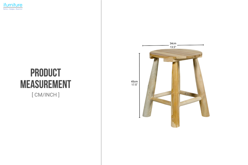 This teak wood round stool is crafted from durable, solid teak, showcasing its natural grain and warm tones. The slatted round seat adds a rustic charm, while four angled legs with stretcher bars ensure strength and stability. Compact in size and versatile in use, it works perfectly as extra seating, a plant stand, or a decorative accent for kitchens, patios, or living spaces.