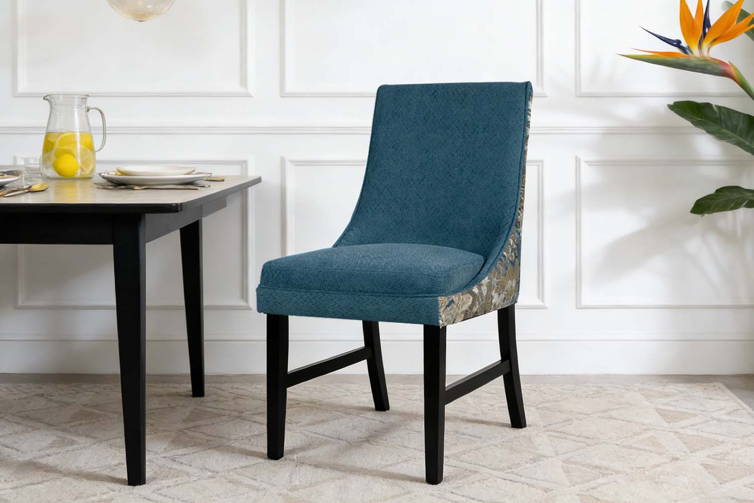 The LANCEY Dining Side Chair brings a refined blend of comfort and style with its high, curved backrest and mixed-fabric design. Featuring a solid blue upholstered seat paired with nature-inspired patterned panels, it adds a unique artistic touch to any space. Supported by dark wooden legs and a plush cushioned seat, this chair works beautifully as both a dining piece and an elegant accent chair.