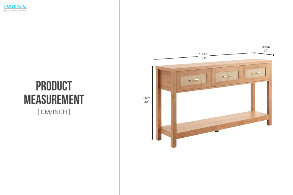 This LAZO 51" console table combines rustic charm with modern functionality. Featuring three spacious drawers with rattan-style fronts, an open shelf for storage, and a sturdy engineered wood structure, it's perfect as a hallway, entryway, or sideboard.