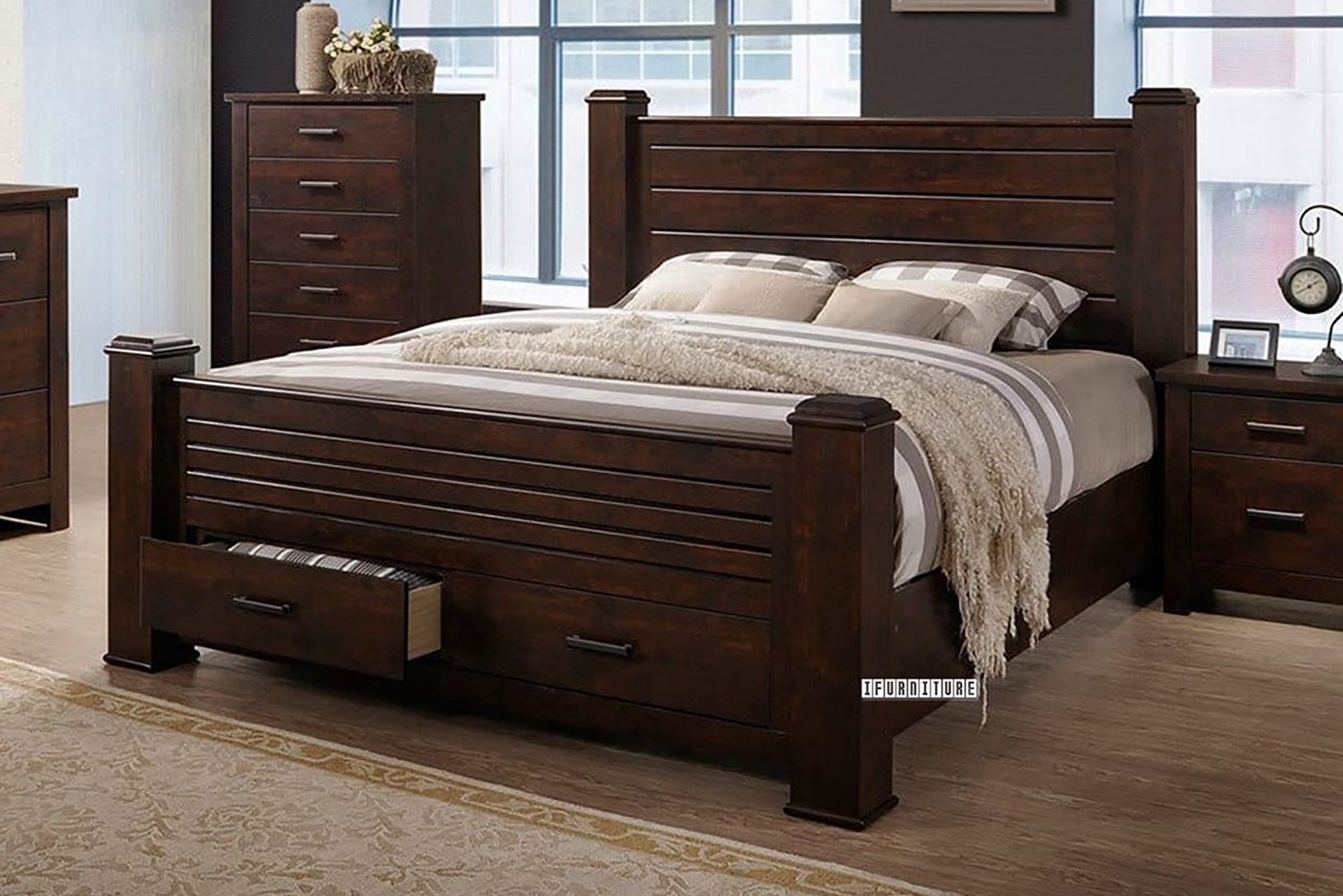 Its versatile dark brown colouring, and clean classic/modern lines, fit a vintage or contemporary look. Pieces available are: Queen bed -with two storage drawers at the foot, bedside table, tallboy, or dressing table and mirror.