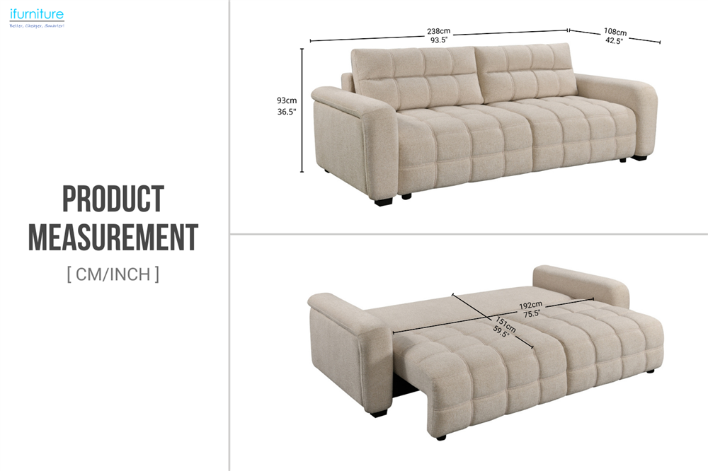 • Convertible Pull-Out Sofa Bed: Easily transforms from a comfortable 3 seater sofa into a spacious bed, providing a practical solution for overnight guests.