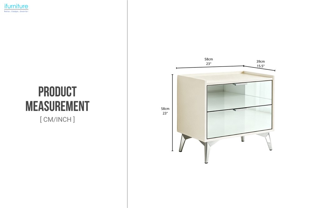 This sleek nightstand features mirror accents, polished metal legs, and two spacious drawers for organized storage. The easy-to-clean melamine surface and premium aluminum handles add both style and practicality to your space.