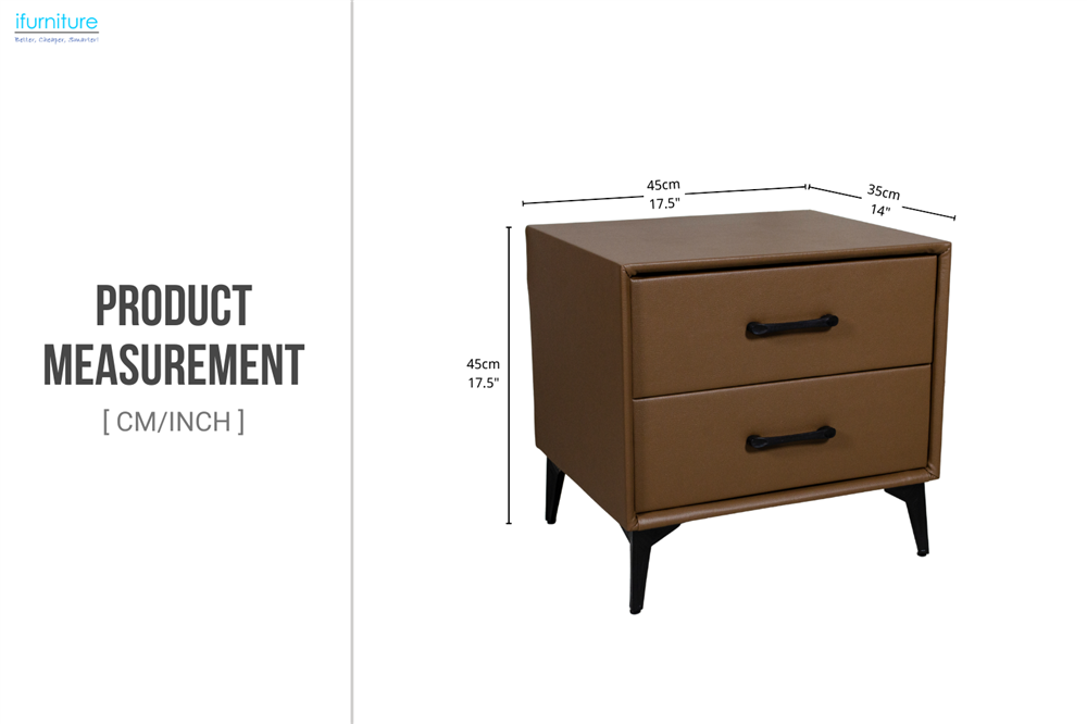 This bedside table features smooth vegan leather upholstery and a clean, minimalist design. With two practical drawers for everyday storage, sleek black handles, and tapered legs that lift the unit slightly off the floor, it offers both style and functionality for contemporary bedrooms.