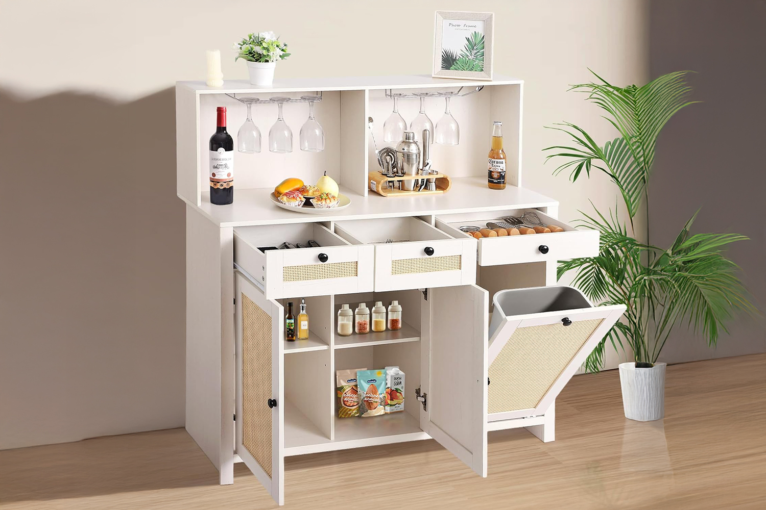 This versatile storage piece features ample space with two cabinets, open shelves for display, a built-in wine rack for up to 9 bottles, and a stemware rack for secure glassware storage. Perfect as a buffet, wine bar, or display cabinet, it fits seamlessly into your dining room, kitchen, or living area, helping you stay organized and stylish.