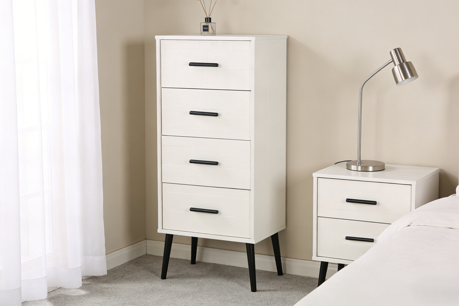 All pieces come in solid pine timber-built to last, and with a white colour. All drawers run smoothly on metal rails and have attractive circular, black handles. Pinewood was used extensively for Colonial furniture, and because of its advantages, is still greatly used today.