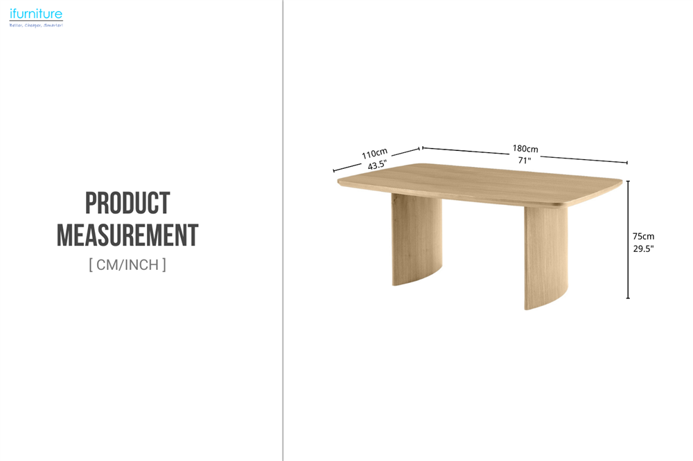 The ROOSTER 71" Dining Table features a thick engineered wood core finished in premium ash veneer with a refined painted surface. Its softly bevelled edge and sculptural curved panel legs create a clean, contemporary statement, combining durability with modern elegance for everyday dining and entertaining.