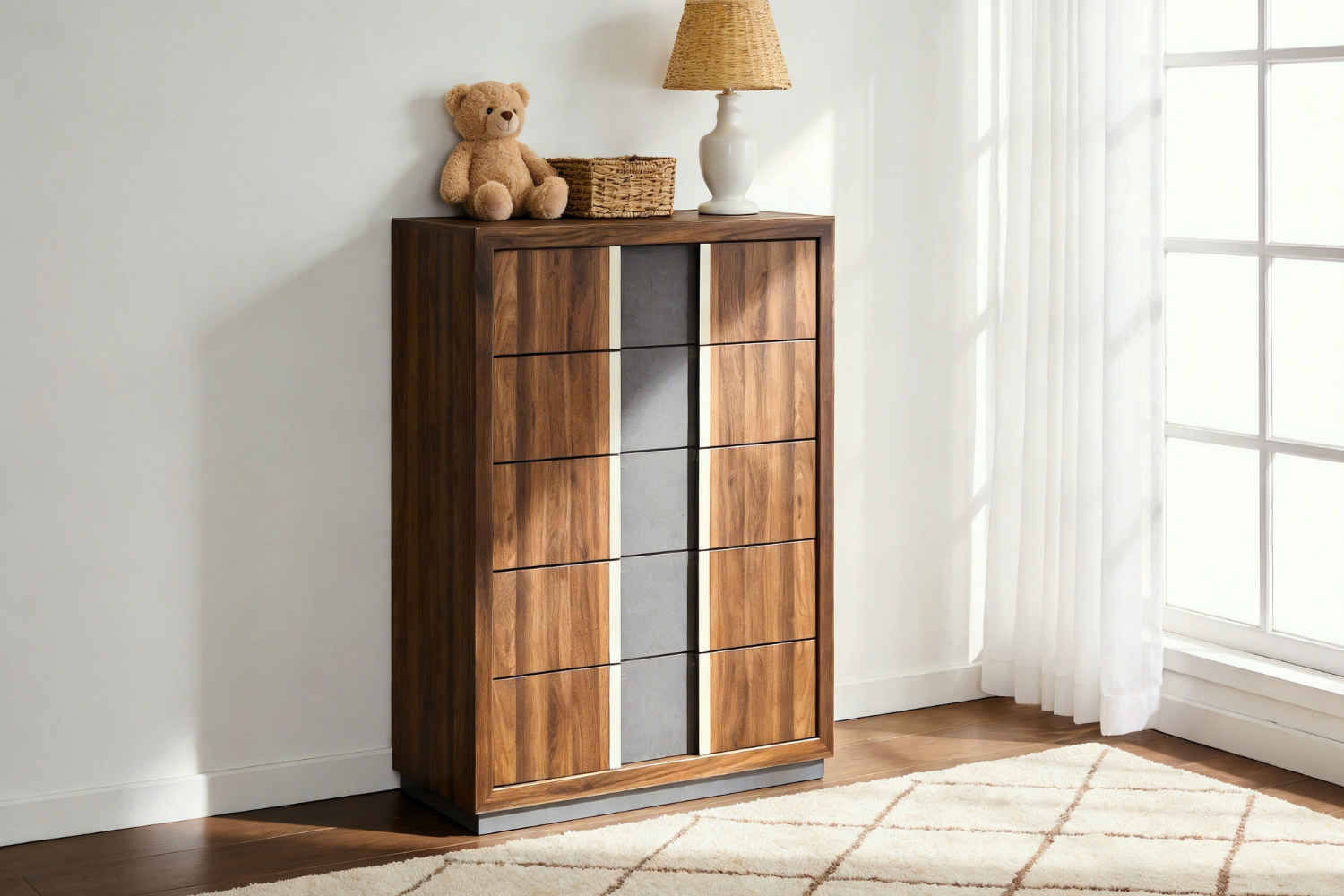 SANDRA 5-Drawer Chest (Walnut)-iFurniture-The largest furniture store in Edmonton, now landed in Calgary. Carry Bedroom Furniture, living room furniture,Sofa, Couch, Lounge suite, Dining Table and Chairs and Patio furniture over 1000+ products.