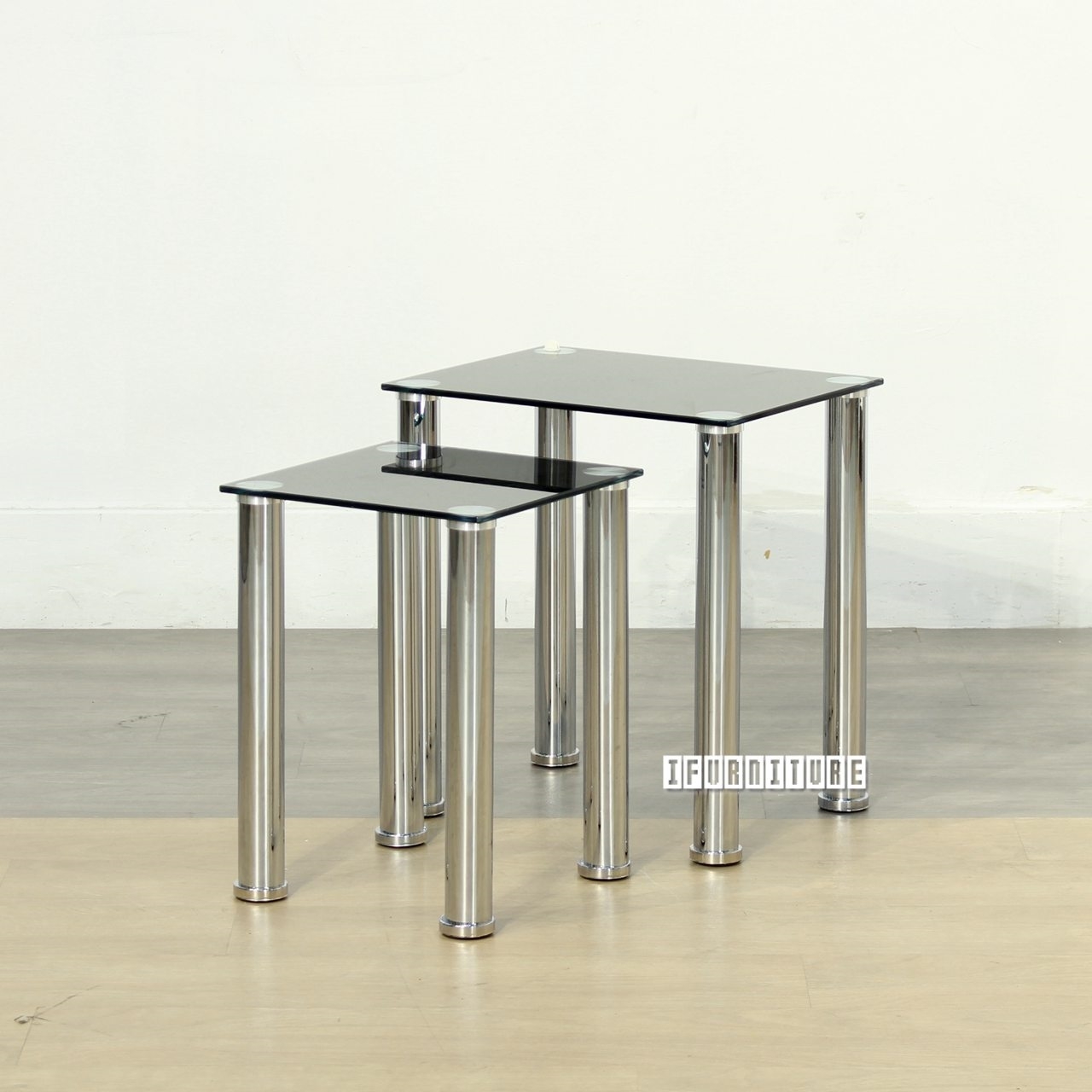 These black glass nest of tables have a contemporary feel with a chrome plated finish. Flexible for a range of uses.