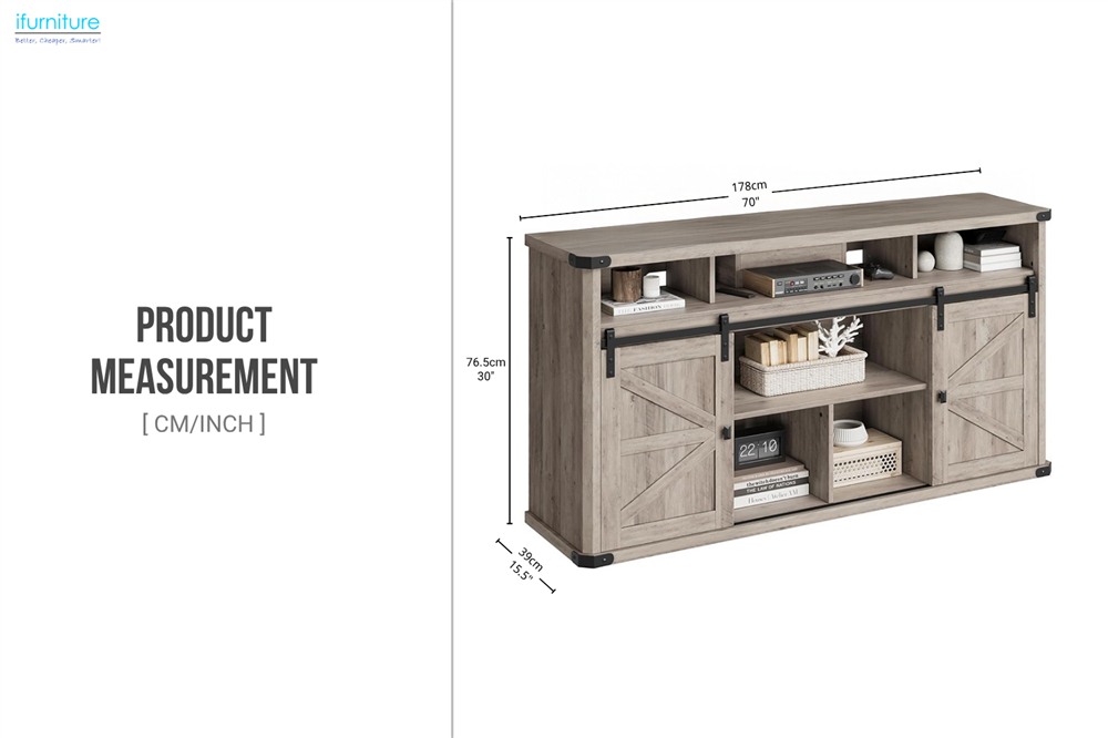 The VERO 70" TV Stand blends farmhouse charm with modern practicality. Crafted from durable engineered wood and reinforced metal accents. The two sliding barn doors provide flexible storage options—conceal clutter or display décor as you wish—while the built-in power strip and cable management keep your media setup clean and organised. With its grey oak colour, this piece brings cosy character and functionality to any living room or entertainment area.
