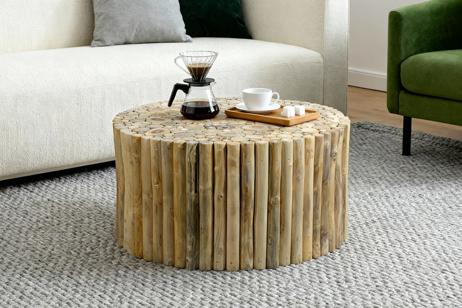 Stacked Teak Branch Construction: Crafted from solid teak branches tightly stacked together, forming a striking cylindrical frame with natural textures and organic patterns.
