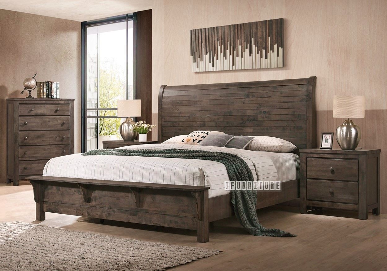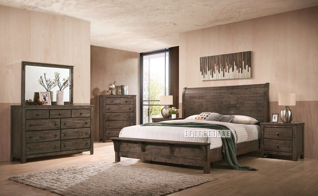 This bedroom set includes a bed frame, night stand, tallboy, and dresser with a large, distortion-free mirror. Ribbed detailing adds a modern touch, while spacious drawers offer ample storage. Sleek, brushed metal handles and a curved bed frame headboard enhance the design. The dark wood finish complements any style, and the 3PC, 4PC, or 5PC options provide flexibility for different room sizes.