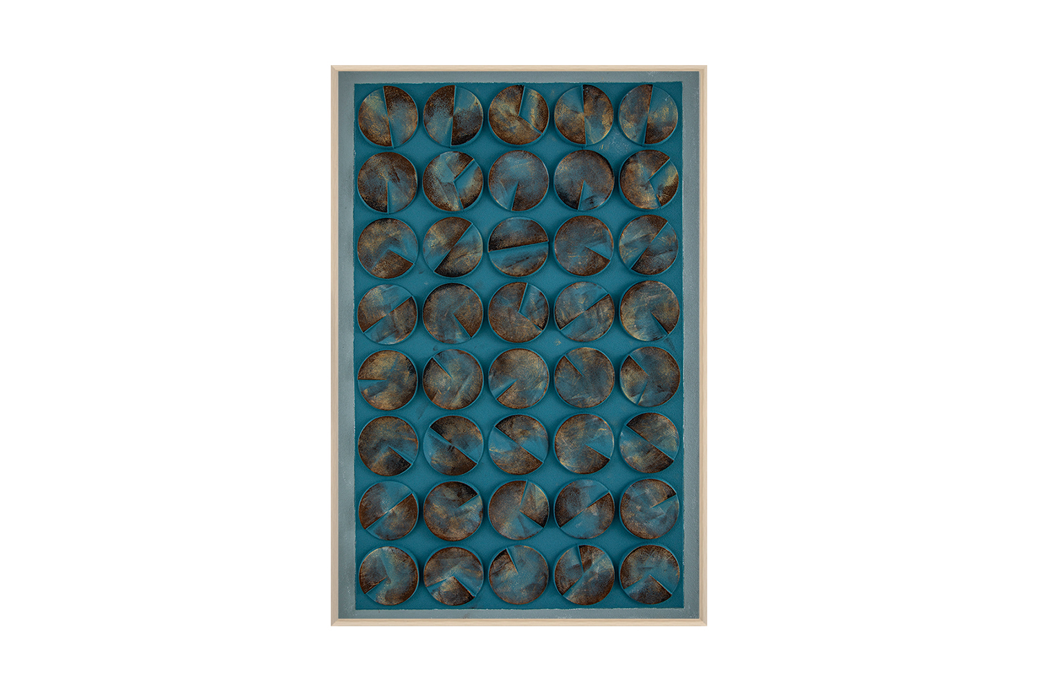This decorative wall art combines layered geometric forms with rich teal and bronze tones to create depth and visual interest. Raised detailing enhances light and shadow, while the solid wood frame adds strength and a refined finish. A versatile piece that complements modern living spaces, dining areas, offices, and loft-style interiors.