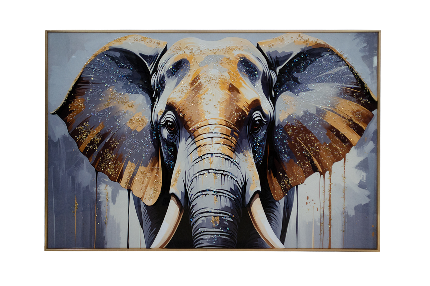 This elephant artwork features a rich blend of warm golden accents and soft grey tones set against a dark background. The striking contrast creates depth and visual impact while maintaining a balanced, modern aesthetic. Finished with a gold-tone frame, it adds a refined statement to contemporary interiors.