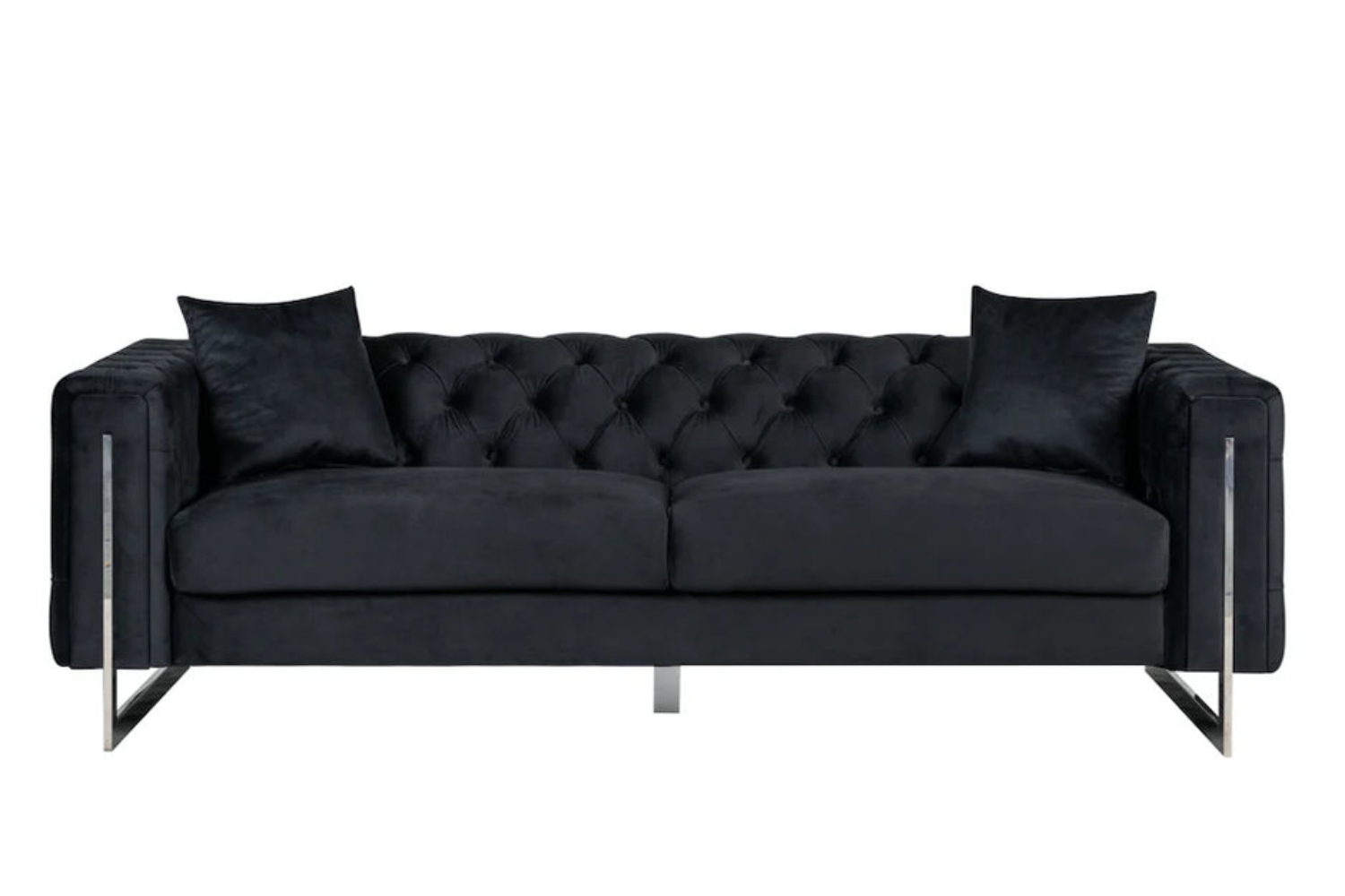 Elevate your home with the ASTRA 3+2+1 Velvet Sofa Range in Black! Luxurious black velvet upholstery, complete with a stylish tufted design, creates an opulent centerpiece. This set includes a 3-seater, 2-seater, and chair, all supported by sleek stainless steel legs for a modern touch. Coordinating pillows add comfort and flair, making it a bold statement piece that seamlessly combines opulence with contemporary aesthetics. Transform your living space into a haven of elegance and comfort with the ASTRA Velvet Sofa Range in Black today!