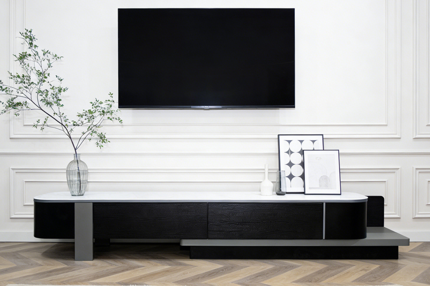 This TV unit features a durable engineered stone top and an extendable design to fit various space sizes. It includes two drawers for hidden storage, offering a clean, minimalist look that suits modern interiors.