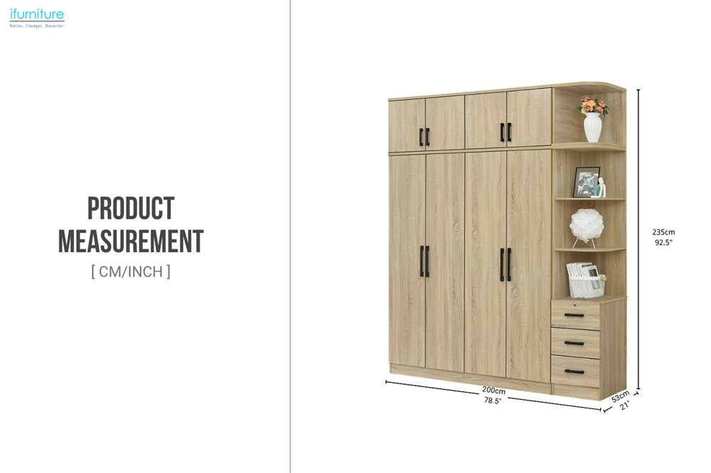 • Comprehensive Modular Design: Includes a 4-door wardrobe, 4-door top unit, 3-tier display shelf with drawers, and a top curved corner display shelf for versatile storage and styling options.