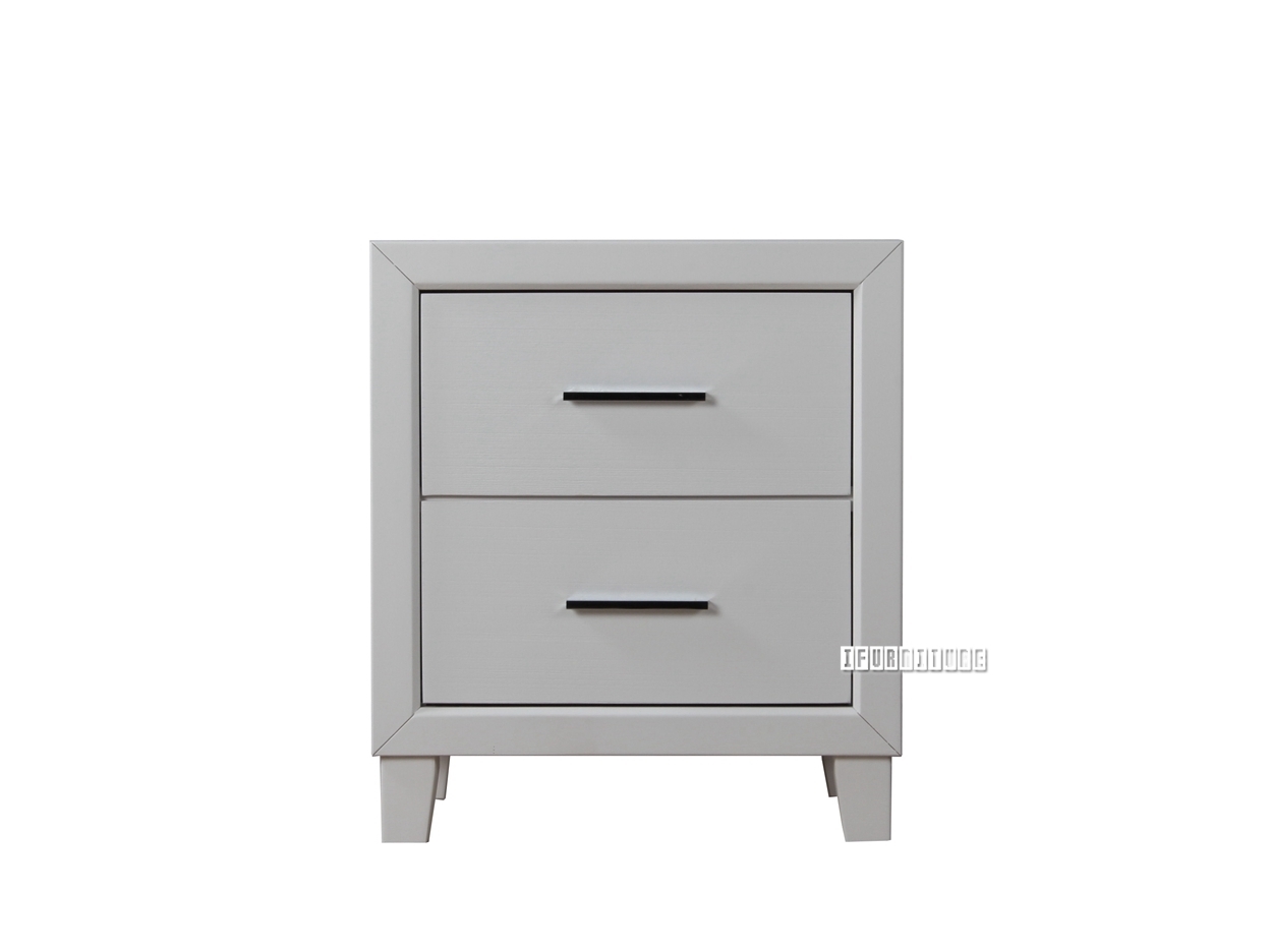 FEATURES: *American style*Matt white bedroom furniture *Drawer handles are sleek gloss chrome *Headboard is padded, grey laminated leather.