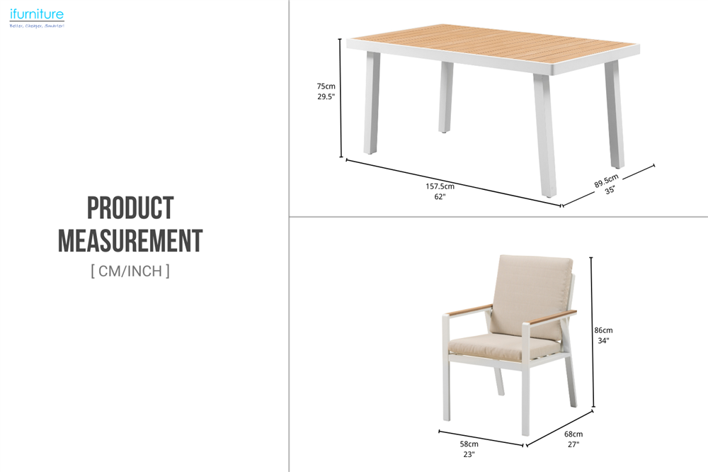 - Wood-Look WPC Tabletop & Armrests: Transfer-printed WPC provides a natural wood aesthetic while ensuring weather resistance and easy care.