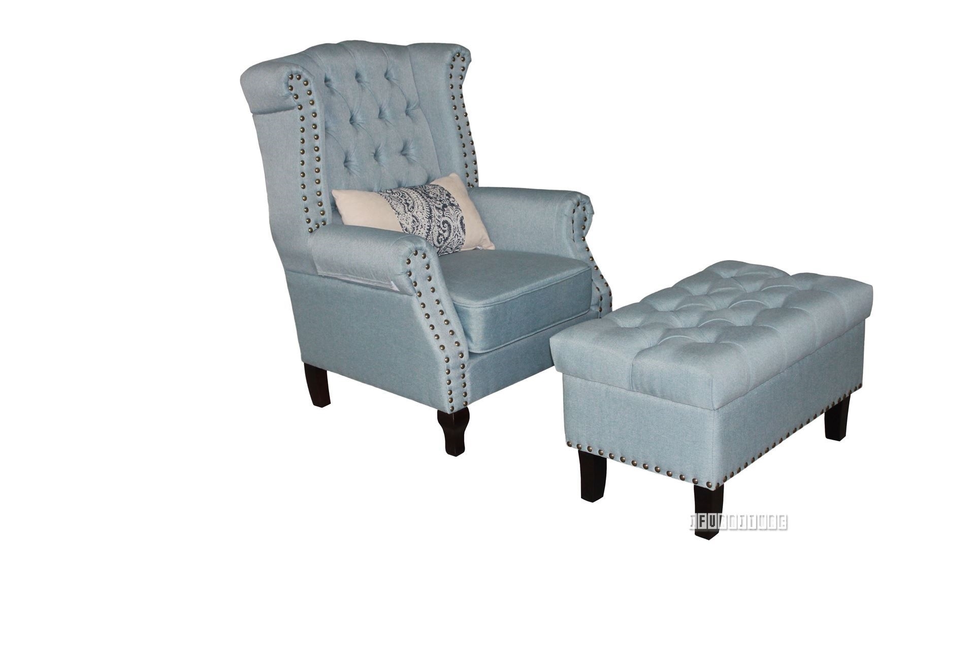 The BRADFORD wing-backed lounge chair includes a footrest to help you relax after a tough day. The seat feels snug and comfy. Both items are covered in durable blue fabric, while the seat back and footrest have buttoning detail adding to the style. There are brass studs around the foot rest and the front of the chair which give a classic feel. Seat cushion can be unzipped for cleaning, but stays firmly in place with a velcro attachment.