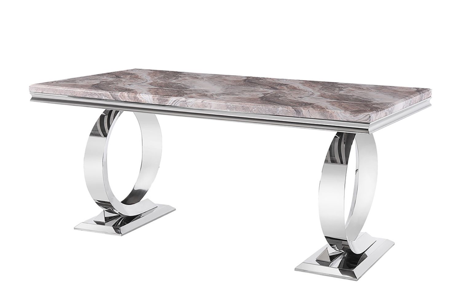 CARRA dining table is ready to elevate your dining area! It has a marble top with a combination of light grey and brwon colour beautifully marked to give your space that elegant accent. What's unique about CARRA is the ring-shaped stainless steel legs and base. It will surely lift your silver and grey modern decor.