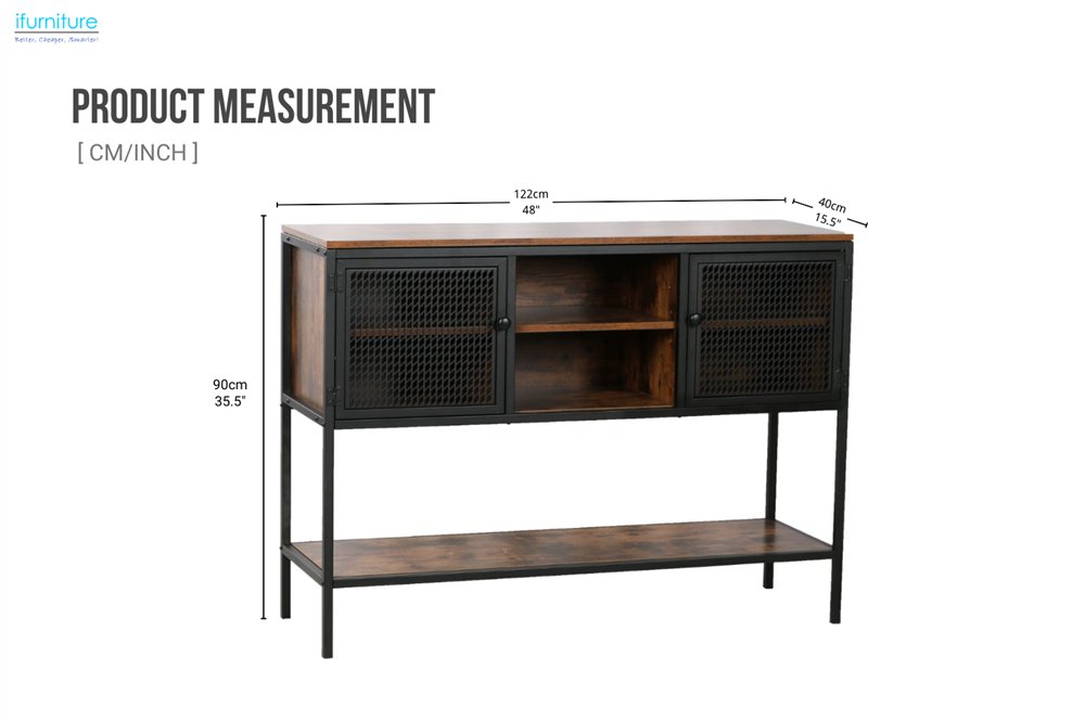 Introducing the CARTER 27.5" Buffet/Sideboard in Brown, a blend of industrial design and functionality. This sideboard showcases a unique half-door design, complemented by sturdy black metal legs, and is constructed from a combination of wood and metal for a stylish and durable addition to your space.