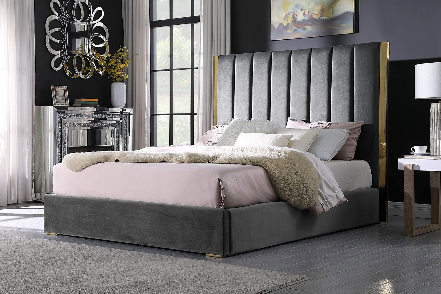 This bed features elegant upholstery with vertical tufting, adding a sophisticated and modern touch to your bedroom. Accentuated by gold-tone metal details, the frame offers a sleek, contemporary design. Its durable construction and slatted support ensure long-lasting stability and comfort, while the tall headboard provides a supportive backrest for sitting up and relaxing.