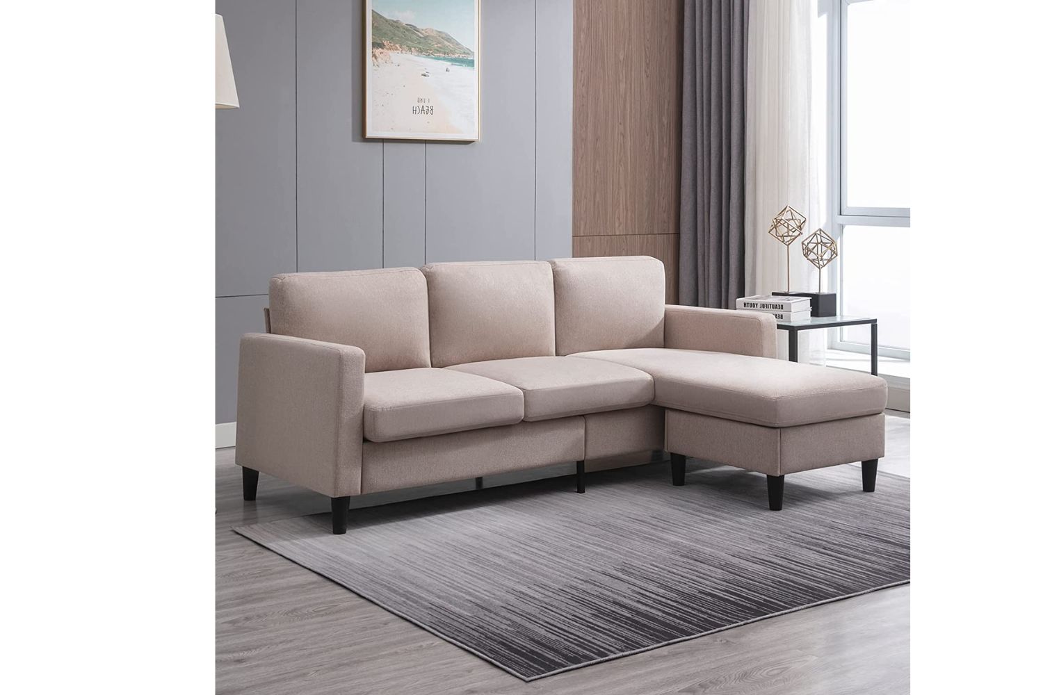 The seating area of the sofa is upholstered in a durable and comfortable linen material, the storage ottoman is designed to fit snugly against the sofa, creating a seamless and cohesive design. The ottoman can be used for extra seating, as a footrest, or as storage for blankets, pillows, or other items. The ottoman has a removable top, providing easy access to the storage compartment inside.