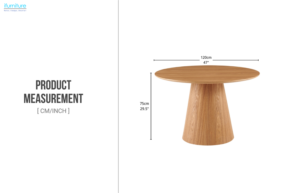 The CREAMCONE D47" Dining Table features a beautifully balanced round silhouette with a striking cone-shaped pedestal base. Crafted from engineered wood with ash veneer, it showcases natural wood grain detailing and a smooth, refined finish—perfect for modern, Scandinavian, and contemporary interiors. Its compact 120cm diameter design encourages intimate dining while offering strong central support and visual elegance.