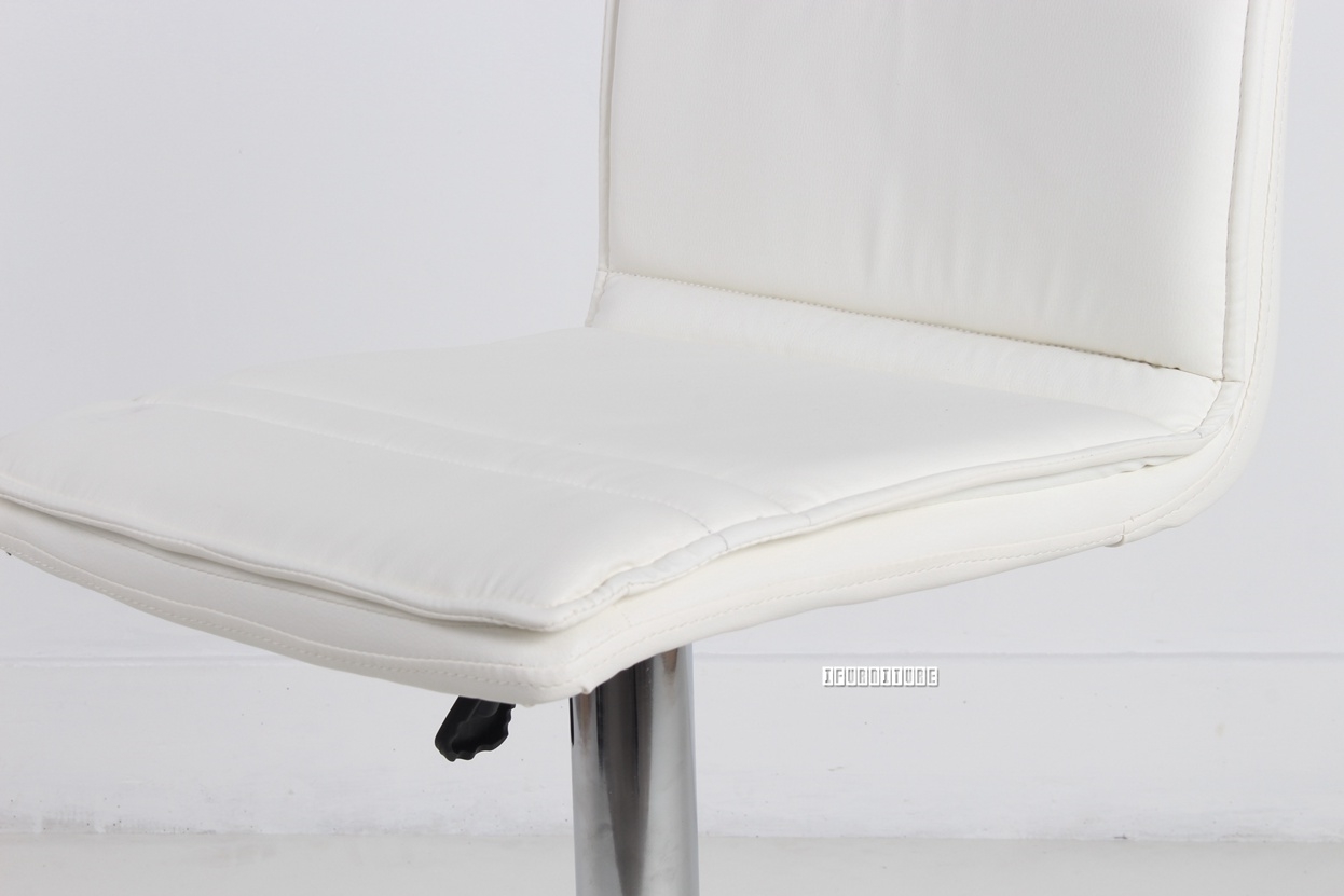 The height is hydraulically adjustable via a handle, and there is a handy footrest, which contribute to the comfort of this great looking stool. Comes in red, black or white pvc.