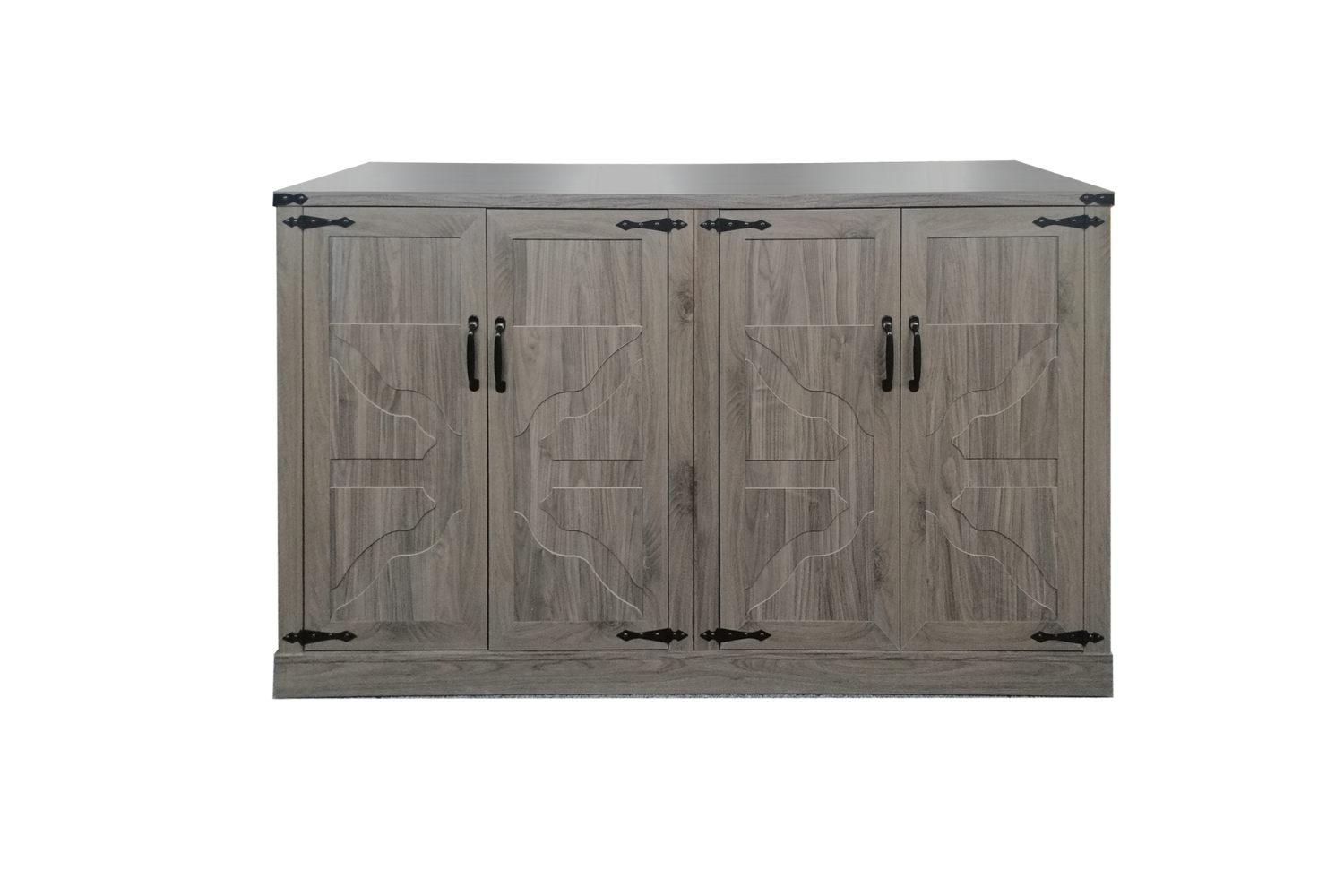 • Decorative Details & Metal Hardware: Carved door panels paired with vintage black metal hinges and handles add a farmhouse touch.