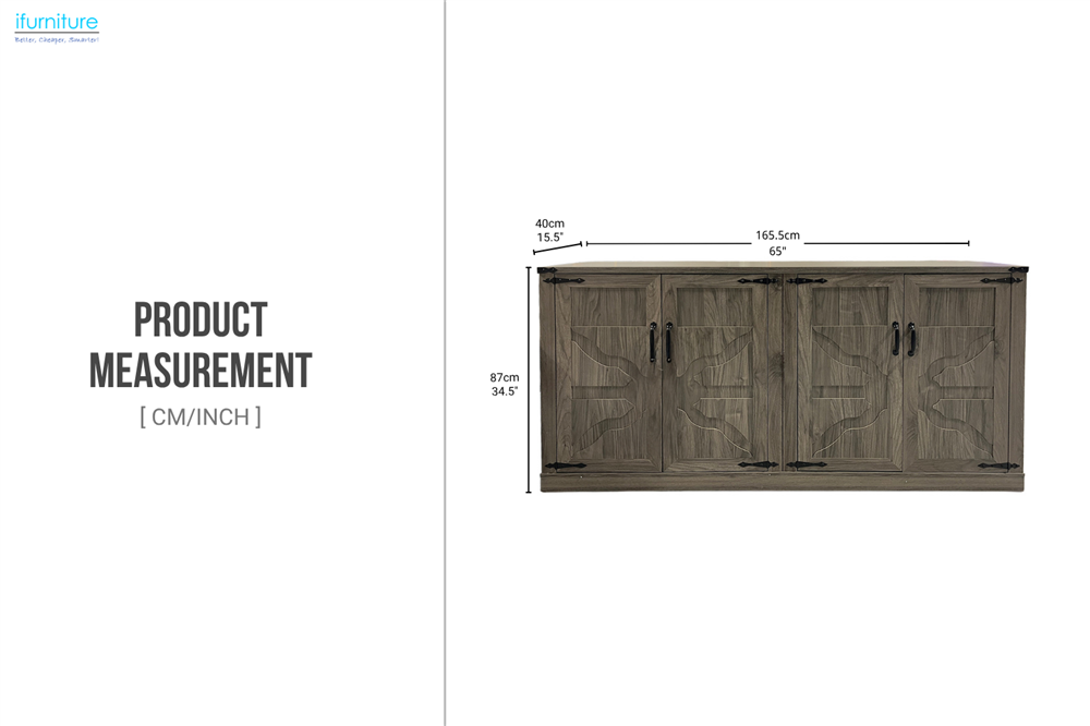 The Dorn 4-Door Cabinet blends rustic elegance with everyday functionality. Crafted from durable engineered wood, it features a warm wood-grain finish, carved door panels, and vintage metal hardware. Four spacious compartments with adjustable shelves offer versatile storage for tableware, books, or home essentials, making it an ideal addition to dining rooms, living spaces, or hallways.