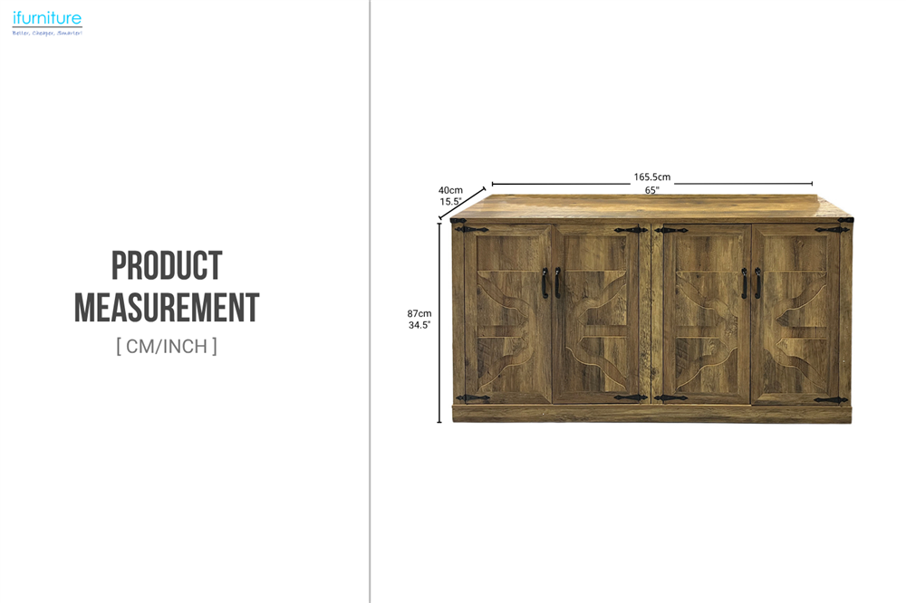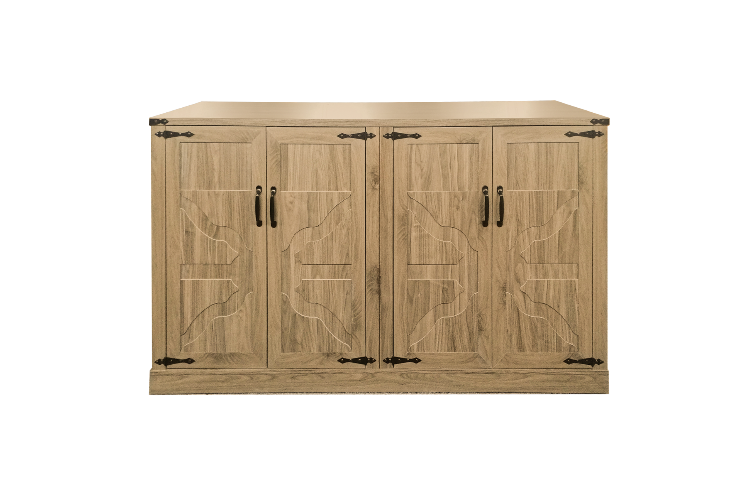 The Dorn 4-Door Cabinet blends rustic elegance with everyday functionality. Crafted from durable engineered wood, it features a warm wood-grain finish, carved door panels, and vintage metal hardware. Four spacious compartments with adjustable shelves offer versatile storage for tableware, books, or home essentials, making it an ideal addition to dining rooms, living spaces, or hallways.