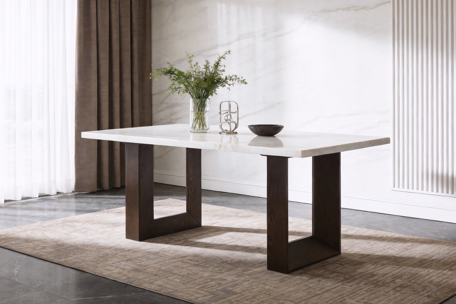 The Edwyn 68" Marble Top Dining Table features a stunning white marble top with unique veining and an Ash wood veneer finish. Its durable construction and versatile design make it a perfect blend of luxury and practicality for modern dining spaces.