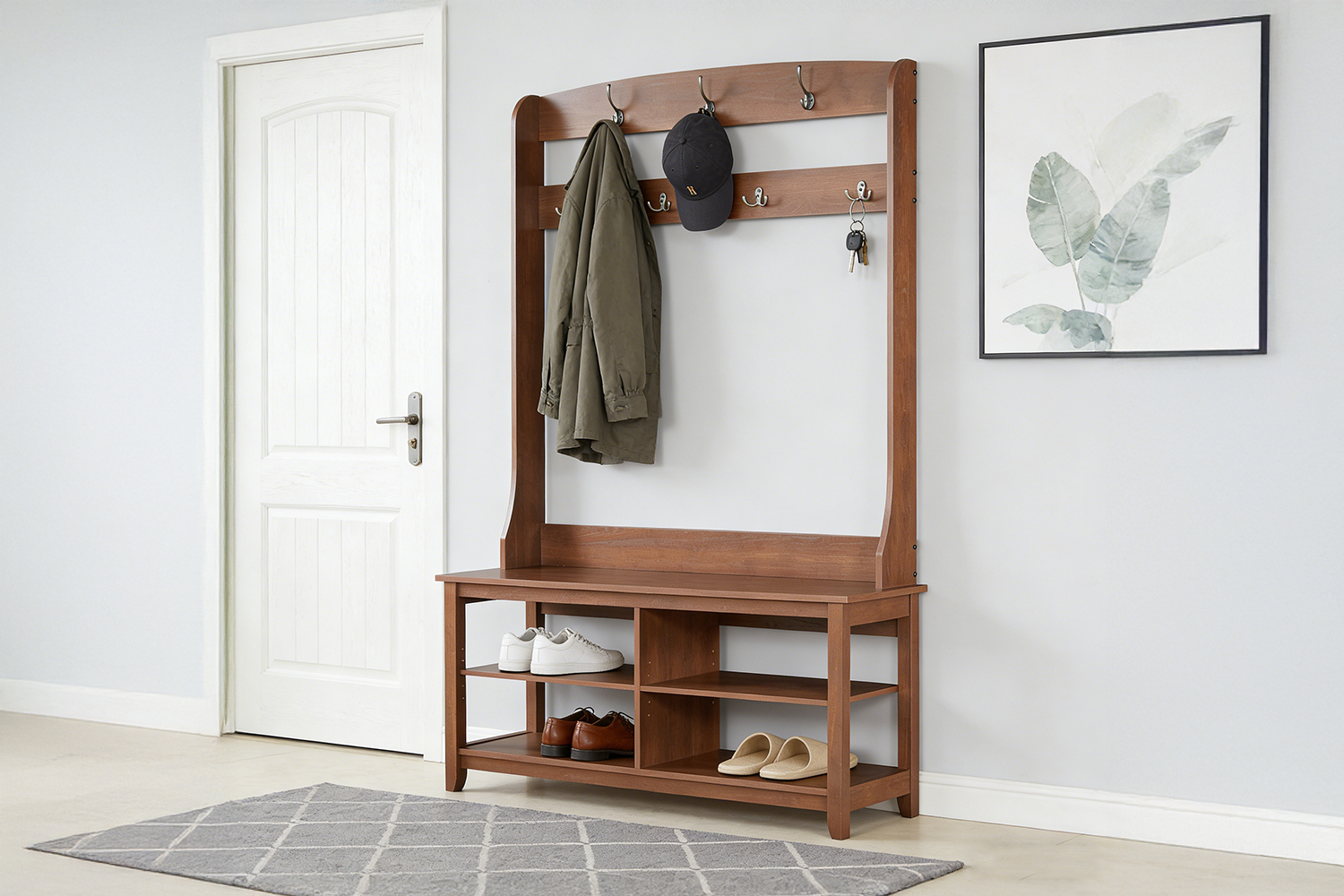 • Convenient Hooks: Features several metal hooks on the upper section for hanging coats, hats, bags, or scarves, making it a functional and practical storage solution.