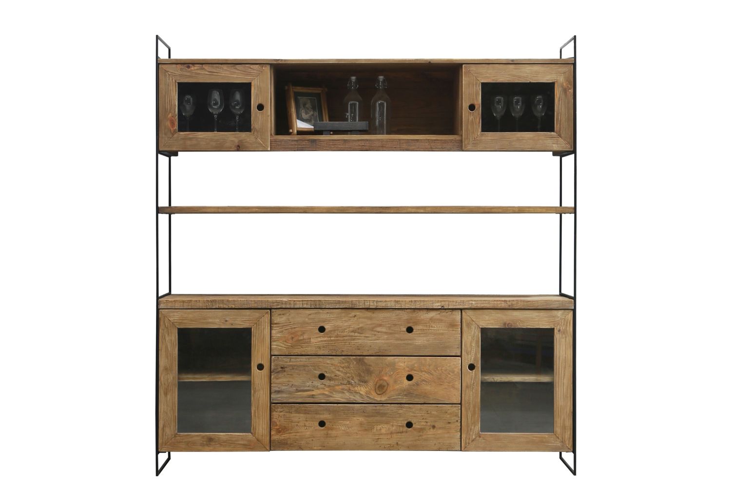 Meet the ELMORE Reclaimed Pine Wood Cabinet & Shelf (74.8" x 70.8") – a harmonious fusion of rustic charm and modern convenience. Crafted from resilient reclaimed pine wood, this cabinet transcends mere storage; it becomes a captivating focal point for your dining area, infusing personality into the space. Delving into the exciting details, the iron and glass doors serve as chic accessories, providing an industrial edge that's effortlessly on-trend. Swing open the two substantial doors below, and voila! Abundant space awaits for all your dining essentials, complete with three convenient shelves for meticulous organization. At the top, two smaller doors and a central shelf offer a showcase for your elegant dishes or a personalized touch with decor. With its durable reclaimed pine wood construction, sleek iron accents, and contemporary glass doors, this cabinet goes beyond mere storage; it makes a resounding style statement. The ELMORE 74.8"Large cabinet is the key to a dining room that seamlessly combines functionality with fabulous chic.