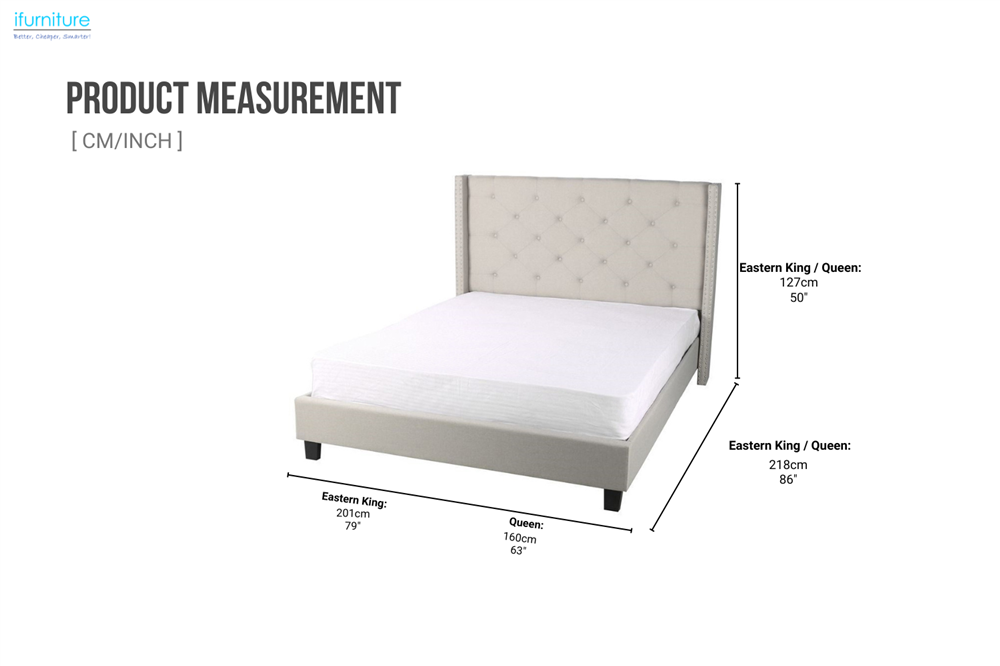 Say hi to the ELY Linen Upholstered Bed Frame – your cozy escape awaits, now available in Queen or Eastern King sizes! Built with a solid wood frame, reinforced with plywood, and held up by sleek plastic legs, this bed frame effortlessly brings together durability and style. Draped in luxurious 100% Polyester linen fabric in a soothing beige tone, with charming button details on the headboard, it adds a timeless touch of elegance to your room. The tufted wingback design not only catches the eye but also creates a cozy nook for relaxation. And here's a bonus – no need for a box spring or foundation, thanks to the included wooden slats. Turn your bedroom into a tranquil retreat with the ELY bed frame – the perfect spot to unwind after a hectic day!