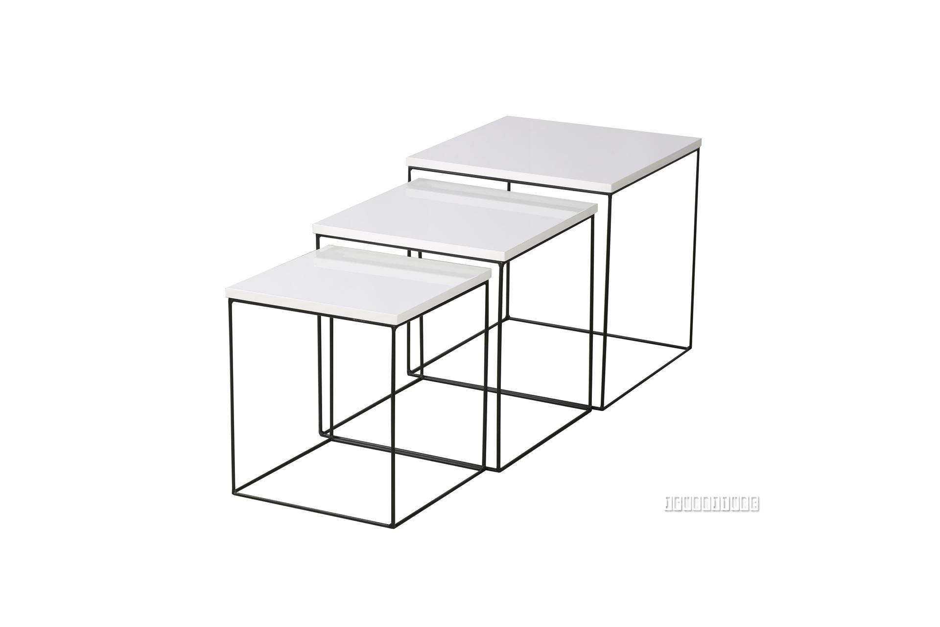 Our FALCON nest of 3 tables have a rectangular, white, top surface and an interesting cantilevered, black steel, base.