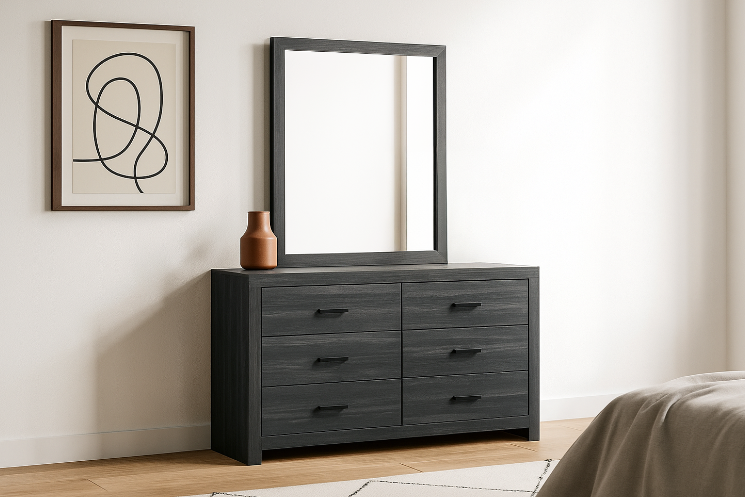 The HAIDEN 6-Drawer Dresser with Mirror blends modern functionality with a sleek, minimalist look. Finished in a charcoal grey wood tone with subtle grain detail, it offers a grounded yet refined aesthetic perfect for contemporary bedrooms. The wide dresser features six spacious drawers with recessed handles, creating a clean and uninterrupted front profile. A square-framed mirror sits flush atop the unit, providing both style and everyday convenience.