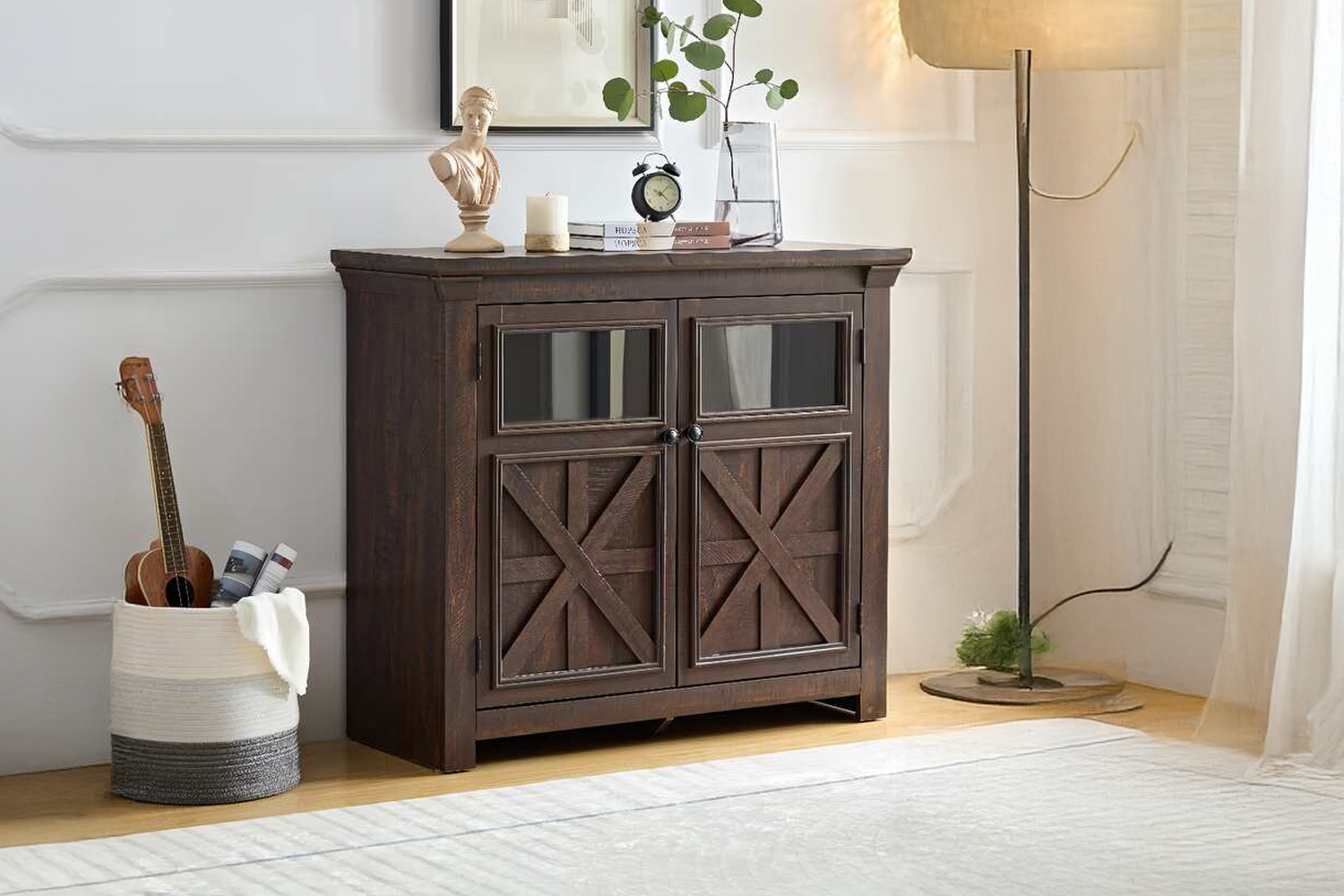 This elegant cabinet features an espresso finish, complementing various home styles and adding sophistication to any room. The vintage cross doors and metal handles create a rustic charm. With double doors and two internal shelves, it provides ample storage for books, dinnerware, wine, and more, making it a perfect addition to your home decor.
