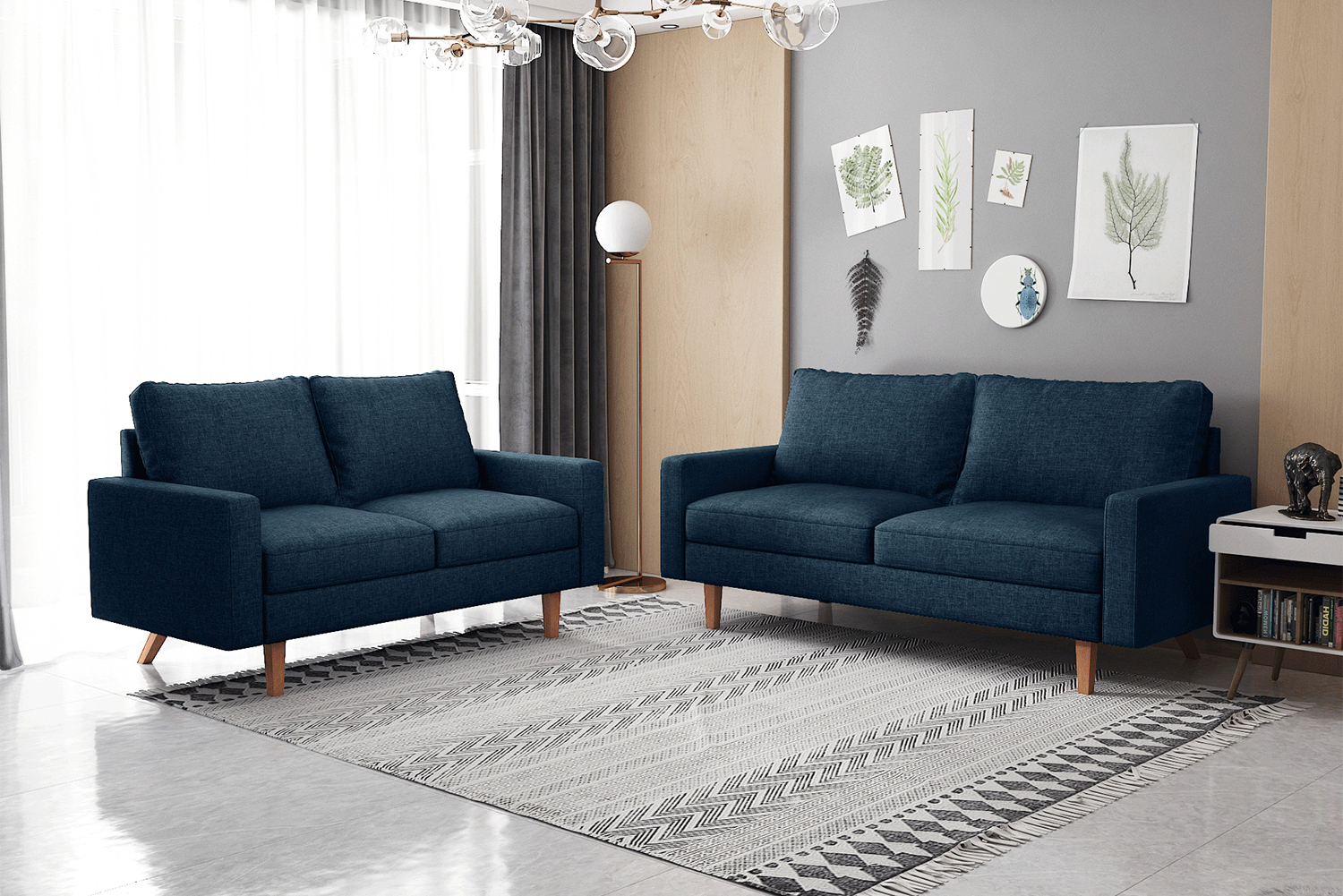 The sleek style of the MAC set comprises a 2 & 3-seater -upholstered in an attractive, dark gray and dark blue fabric. Each comfy and supportive seat has its own seat cushion -so no ‘falling through the cracks here. The brown, solid wooden legs match the upholstery nicely.