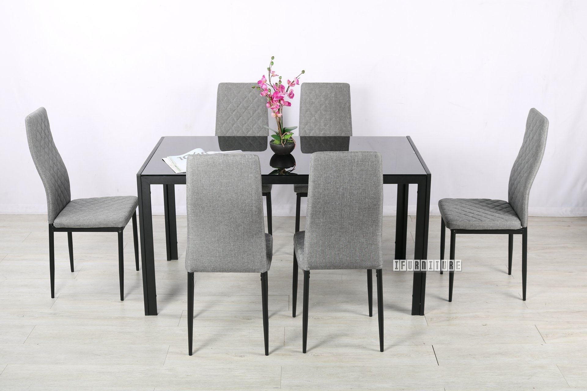 The table top is of tempered frosted glass, with frame and legs being black powder coated. The matching chairs are made of grey fabric, also with black powder coated legs.