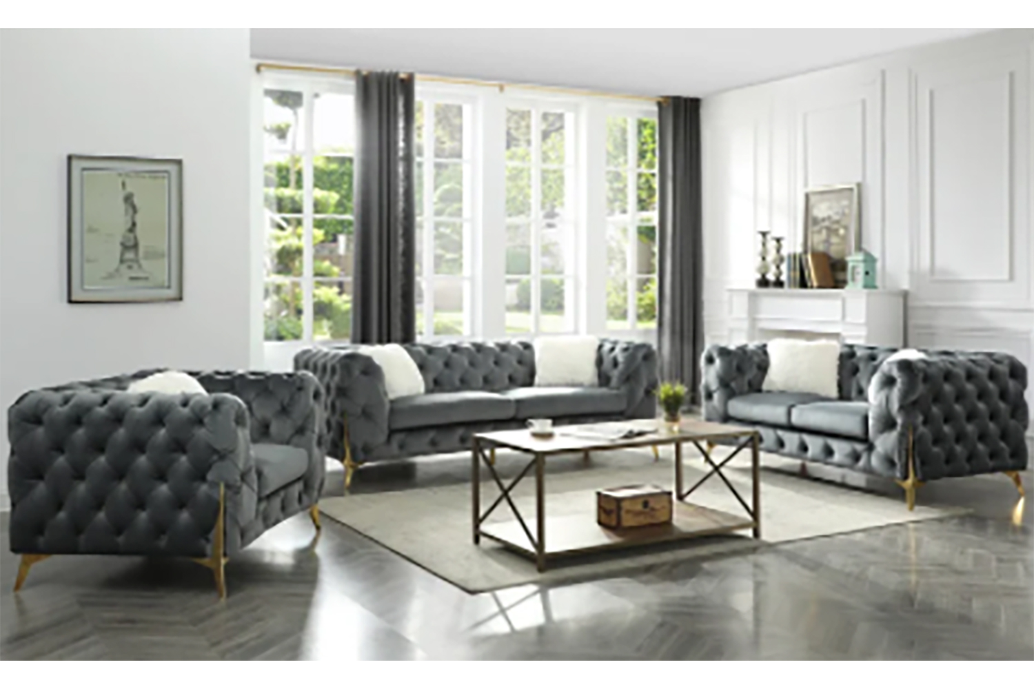 The perfect piece to reflect your regal tastes, this classic MANCHESTER classic nailhead chesterfield sofa anchors your seating ensemble in timeless appeal. This ultra-soft and comfortable large velvet chesterfield couch comes with old-fashioned scroll armrests and a pleated accent border. Premium velvet upholstery with overstuffed arms and backrests for comfort and gold metal legs. This dapper design strikes an updated, clean-lined silhouette with tight arms and gold metal feet. The velvet fabric upholstery brings out this sofa's glamorous side, while exquisite details including high-density foam fill with spring support, matching bolster pillows. The button-tufted backrest is made entirely by hand. Available in Grey, Black, and Blue.