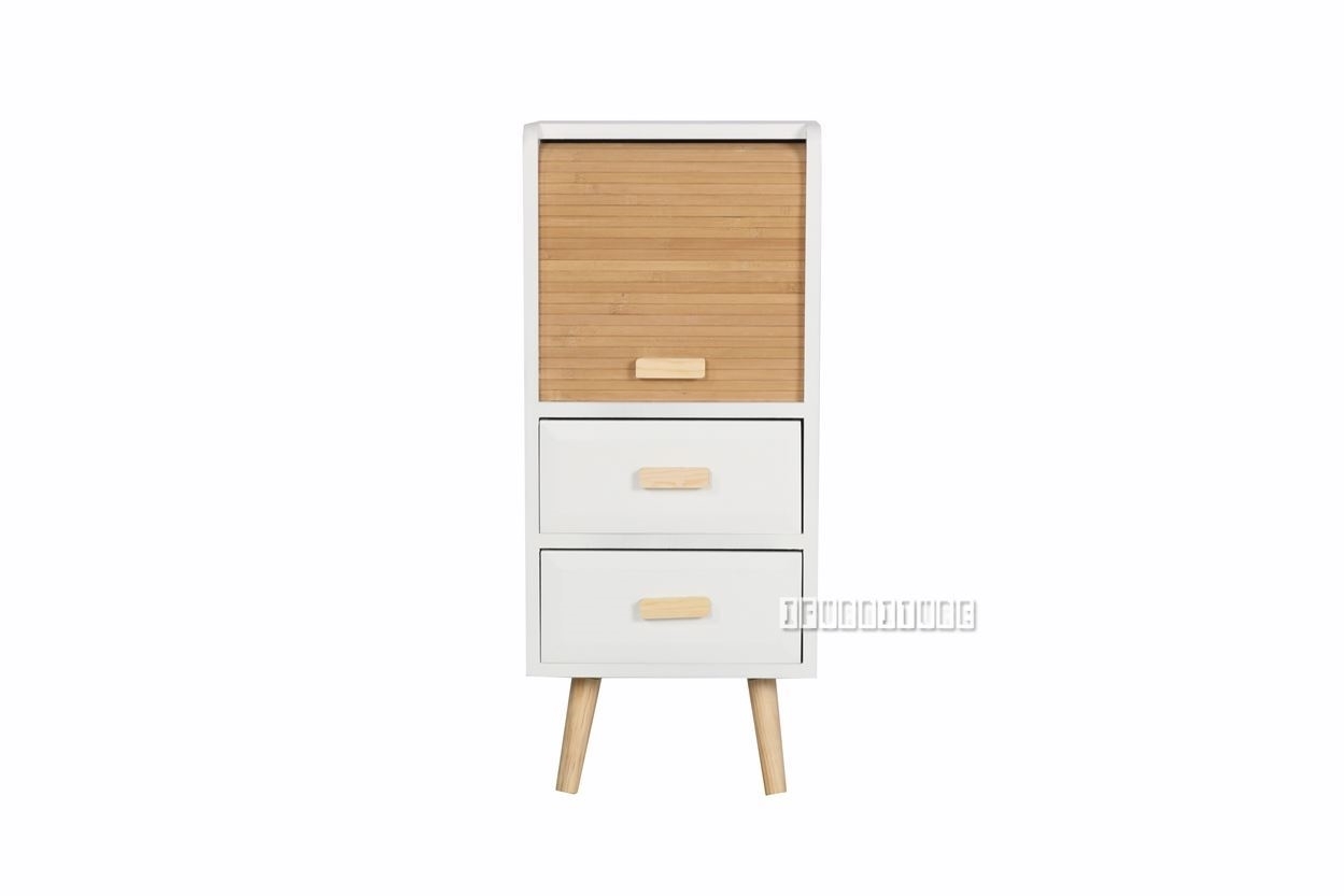 The attractive MANSFIELD series comprises a variety of wooden cabinets -white painted, with round, pine wood legs, and bamboo doors and drawers. Drawer and roll-up door handles are of light pine, and prettily offset the white of the units.